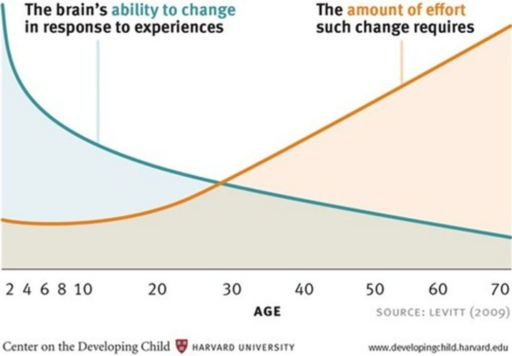 Mira esta gráfica. En ella se ve la «habilidad del cerebro de cambiar como respuesta a las experiencias vividas» (en azul) y «la cantidad de esfuerzo que dicho cambio requiere» (en naranja), según va avanzando la edad.