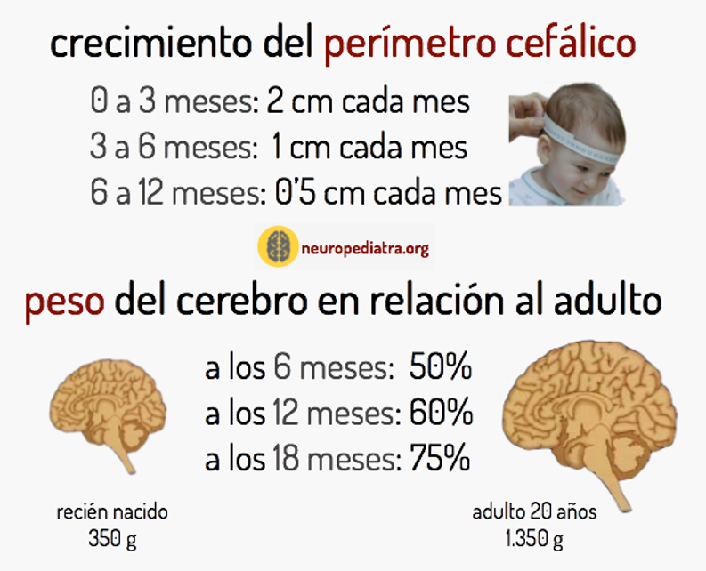 No hay un momento en la vida en el cual crezca tan rápidamente la cabeza como durante el primer año. Y la cabeza, el cráneo, crece para dejar espacio al cerebro que también lo hace. Así que, lo que observamos por fuera (esa cabecita que crece tan rápidamente) es también lo que está ocurriendo dentro (el cerebro crece a la misma velocidad).